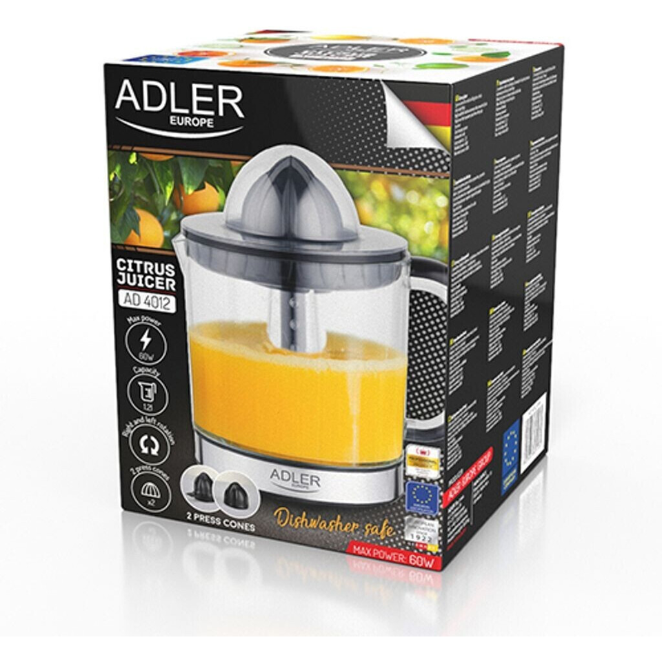 L’Adler AD 4012 è un potente spremiagrumi con 40 Watt di potenza e metodo di spremitura a pressione del cono. Dotato di 2 coni spremiagrumi di diverse dimensioni e setaccio per polpa di frutta, è facile da pulire in lavastoviglie.